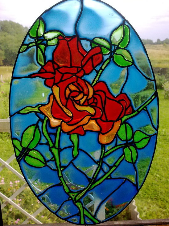 Роспись (заливка) – Тоже имитационная техника, только рисунок не наклеивается, а раскрашивается на стекле своими руками стекспециальными витражными красками. Роспись получается прозрачнее, а заливка дает более яркие, насыщенные витражи.