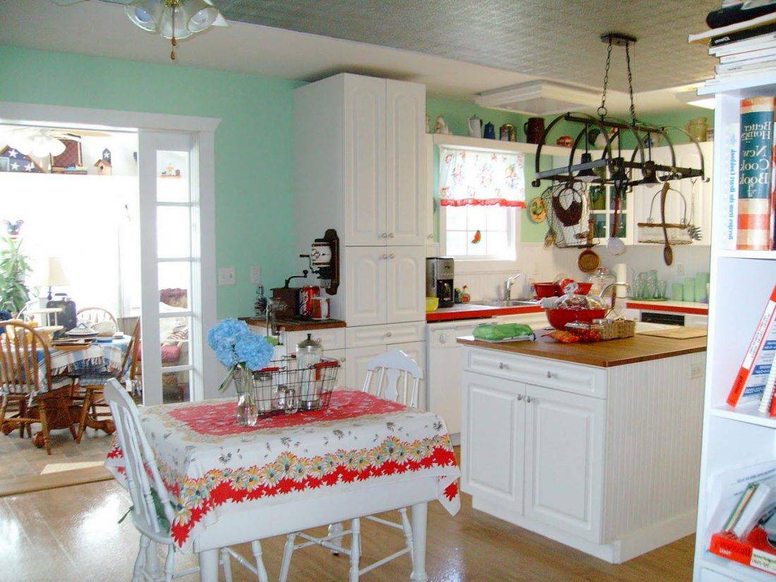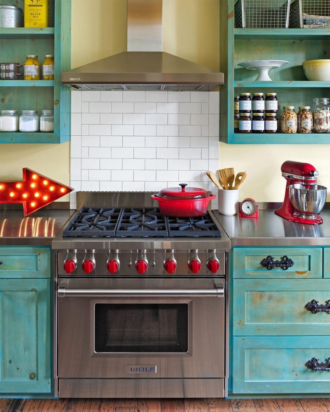 Основная отделка стен обычно выполняется в достаточно ярких цветах. Это может быть однотонная яркая поверхность, но желательно чрезмерно кислотные оттенки размещать на одном участке – в обеденной зоне, на фартуке, в углу за обеденным уголком. Обои можно выбрать сочные, с достаточно четким рисунком – полоской, ромбиком, в клетку или полоску, в цветочек или горошек. Кстати, именно горошек будет смотреться наиболее гармоничным в винтажной кухне.