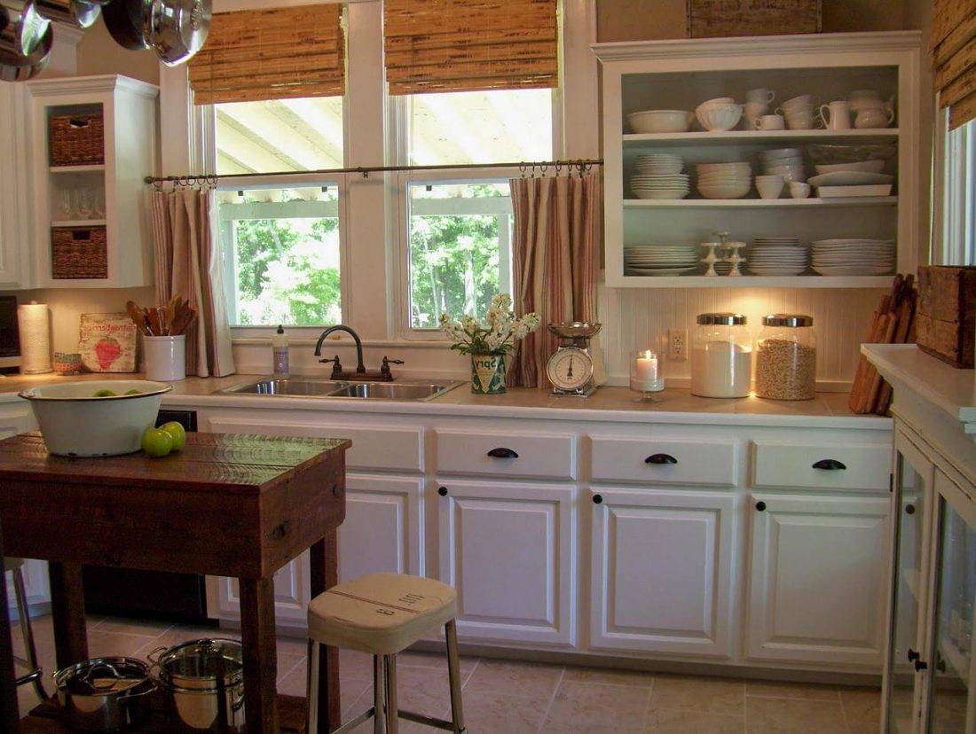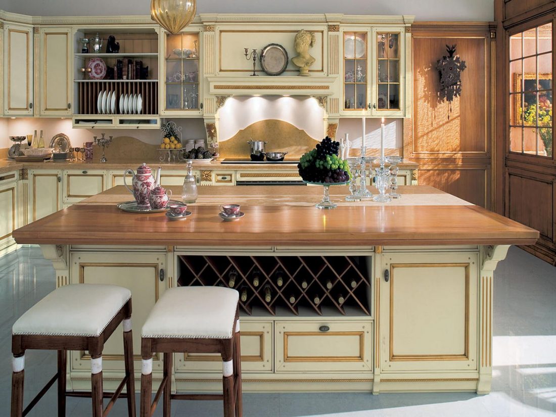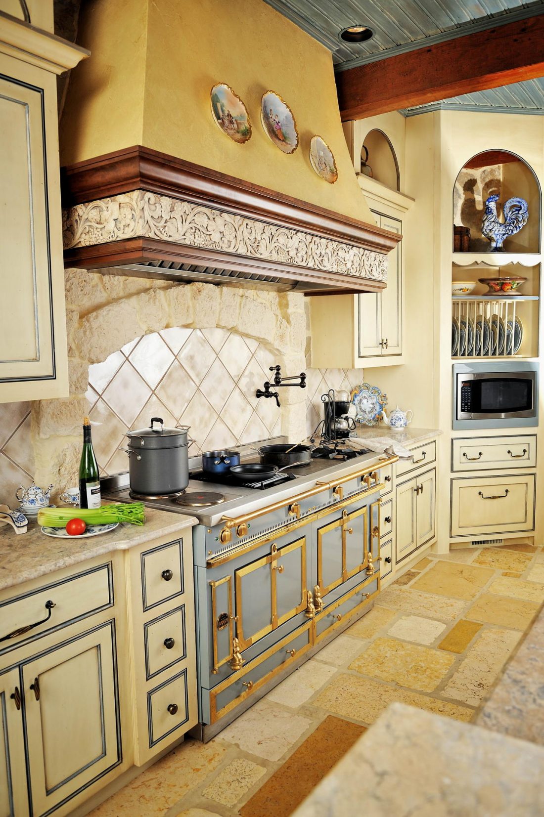 Здесь всегда много декора. Это и резные накладки на фасадах гарнитура, и изящная форма обеденного стола, и шторки, и салфетки, и картины. Можно использовать и портал вокруг вытяжки и плиты, что, кстати, позволит спрятать современную технику. Если есть место для антикварного буфета, в него обязательно нужно поставить декоративную посуду.