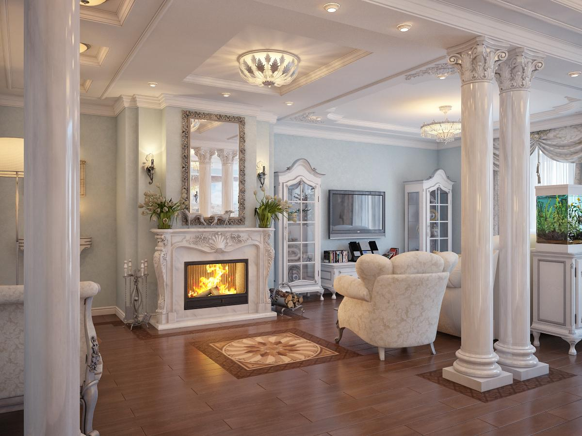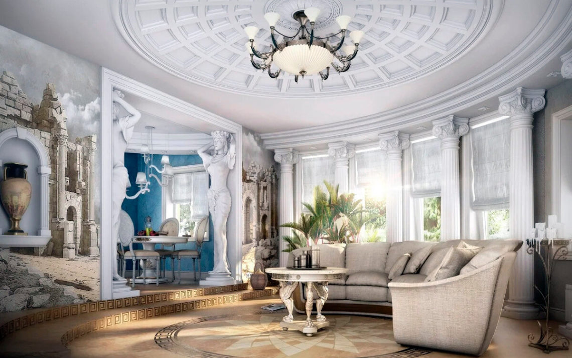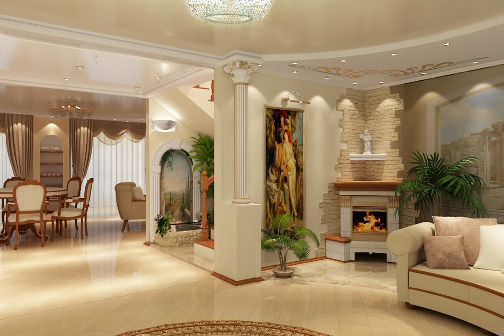 В современных домах атриум фактически заменяет гостиная, откуда есть вход в любую из комнат. Гостиная является самым большим помещением, в котором делают колонны, устанавливают большие скульптуры, вазы под античные. Здесь же ставят кресла с инкрустацией, удобное ложе, небольшие столики на ножках в виде лапок животных. Мебель часто группируют вокруг камина, создавая своеобразную зону отдыха. Возле камина стелят небольшой ковер, но если пол мозаичный, то этого делать не стоит.