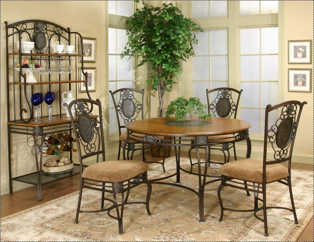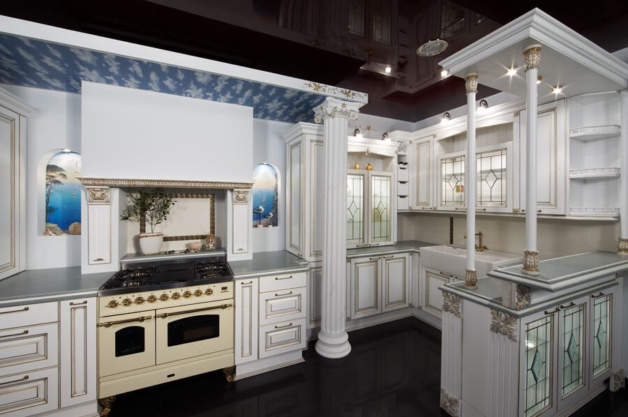Из мебели подойдет кухонный гарнитур с рабочей поверхностью под мрамор, резьбой и зеркальными вставками. Пол лучше выполнять контрастным по отношению к другим помещениям дома.