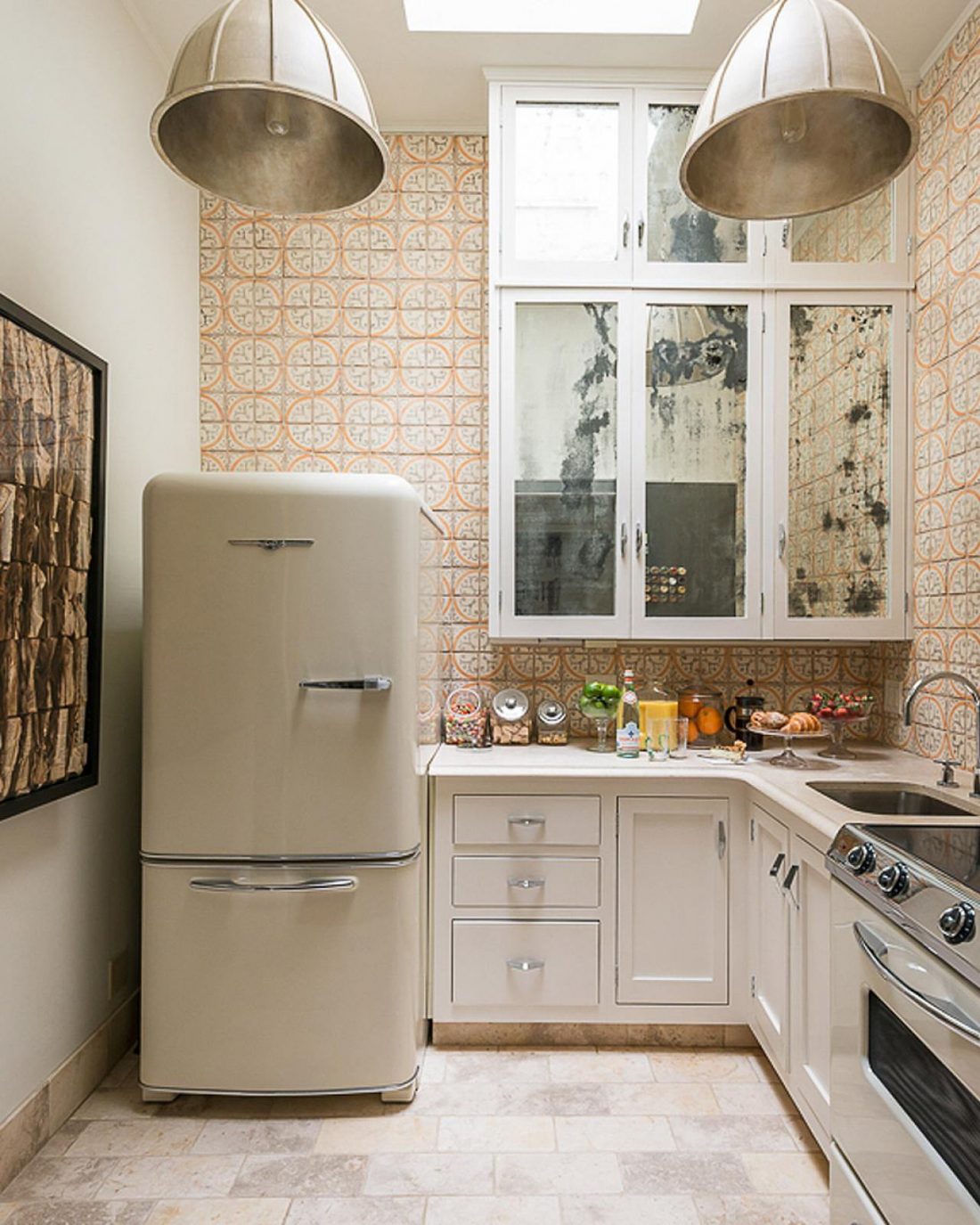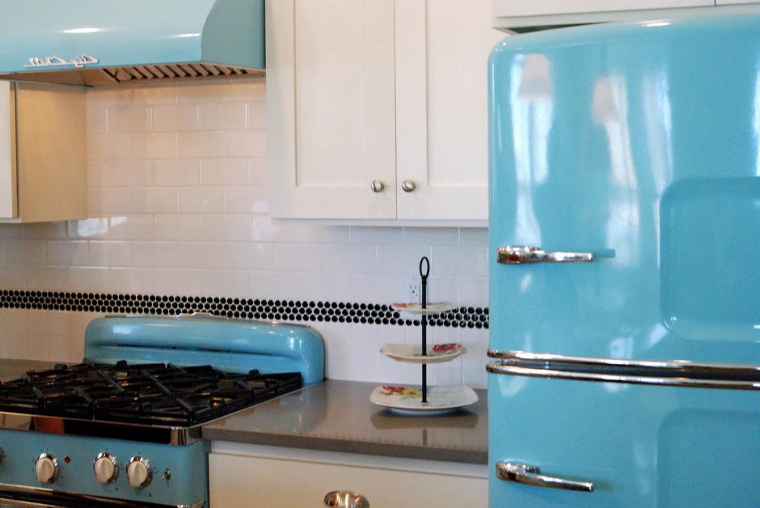 Справиться с внедрением новейшей техники в старинную обстановку можно довольно просто: путем встраивания ее и размещения внутри шкафов. Кроме того, можно найти и ретро модели холодильников и плит, стилизованных под изделия середины XX века.