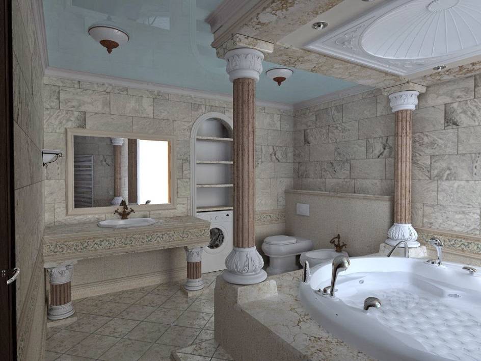 Шикарно в такой комнате будут смотреться круглая ванна и такая же раковина. Смесители лучше поставить под бронзу или золото. Мебель здесь размещается на небольшом подиуме, а комнату украшают живыми цветами, которые ставят в вазы и горшки, выполненные в античном стиле