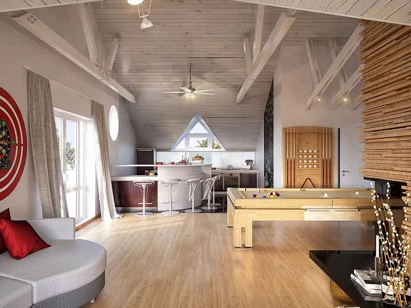 Гипсокартон позволит снабдить дом потолком, который обладает многоуровневой конструкцией. Этот вид покрытия можно сочетать с деревянными балками, что подчеркнет натуральность постройки. Для обшивки потолка можно использовать изделия на основе ДСП, ДВП или пластика, в последнем варианте материал отделки может быть представлен полистирольной плиткой.