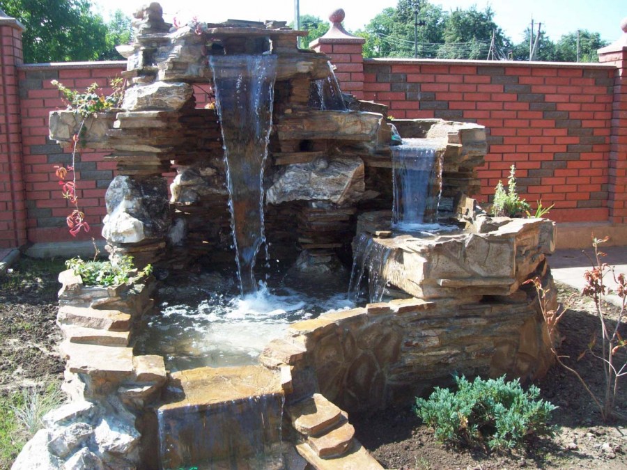 Если вам хочется, чтобы водный поток ниспадал вниз равномерно, образуя плоскую прямую, сделайте каскад с плоскими камнями, имеющими ровные края. Выкладывать их следует по принципу пирамиды. Если вас привлекают струи воды, разбивающиеся на ручейки, обустройте водопад выщербленными, неровными и даже острыми камнями. Если вам нравится медленно протекающий и умиротворяющий поток струящейся воды, то используйте для создания каскада камни, имеющие углубления посередине. Заполняясь, вода из таких природных чаш будет плавно выливаться в последующий ярус, находящийся немного ниже по уровню. Как бы там ни было, все уступы вам придется класть на раствор цемента. Продумайте специальные бортики в нижнем порожке, так вы предотвратите возможность большого разбрызгивания воды из искусственного источника.