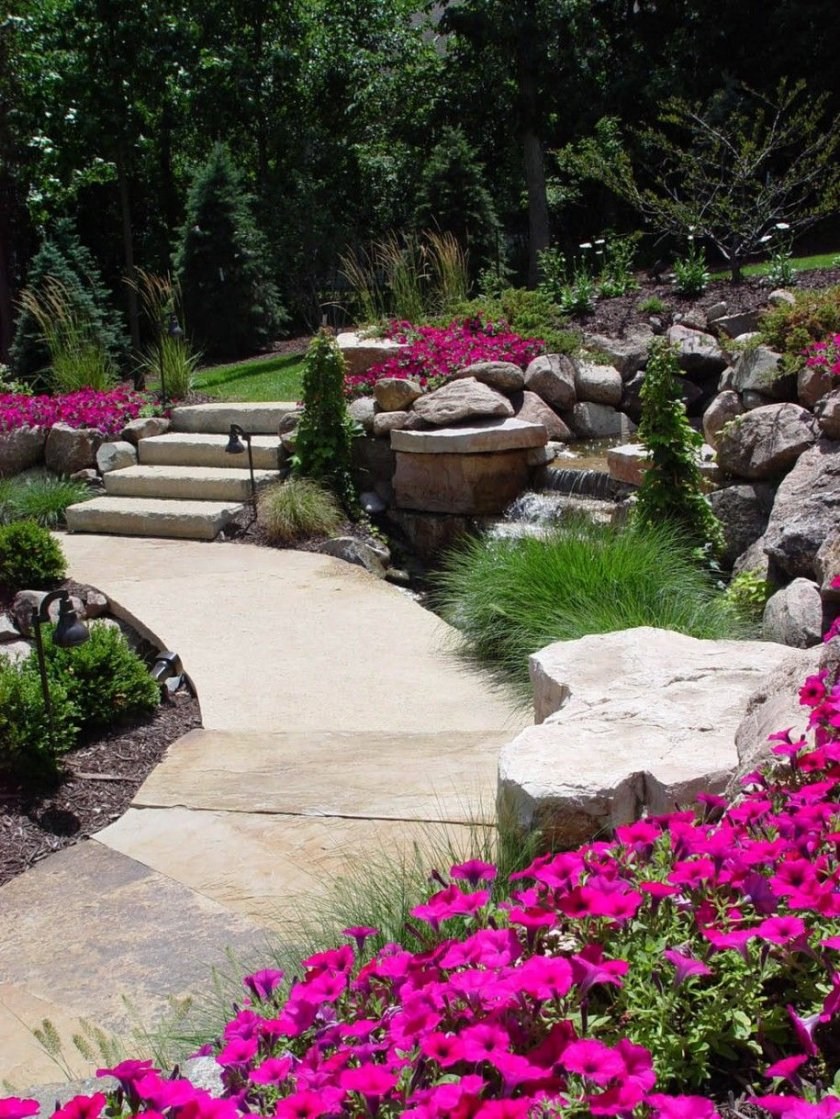 Сочетание камней, цветов и струящейся воды наполнит этот уголок сада умиротворением и спокойствием.