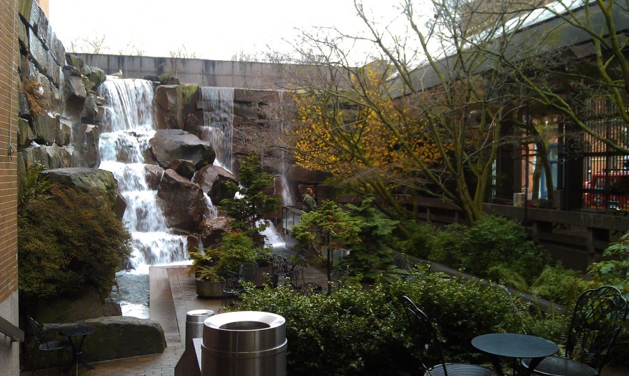 Естественно смотрится водопад, устроенный на естественных возвышенностях и склонах. В противном случае, холм или горку придется построить. Некоторые дизайнеры считают удачным расположение водоема углы, образованные изгородями или подпорными стенками.
