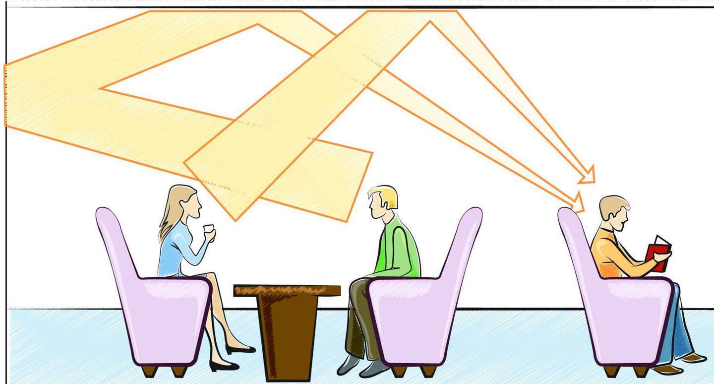 3. Ранние отражения. Высокочастотные (в меньшей степени — среднечастотные) колебания, отраженные от поверхностей, расположенных неподалеку от АС (в основном голых боковых стен, пола и потолка). Они попадают к нам в уши почти одновременно с прямым сигналом, нарушая правильное восприятие локализации источников звука в стереопанораме. Более того, несовпадение фаз прямой и отражённой волн (к тому же гуляющее по частоте) приводит к резкому ухудшению равномерности частотной характеристики.