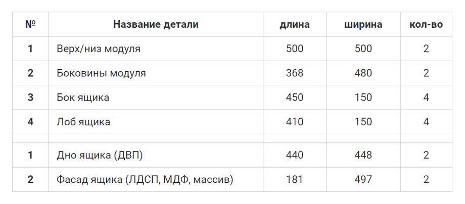 - За ширину боковин модуля возьмите 480 мм (на фасад выделите 20 мм).