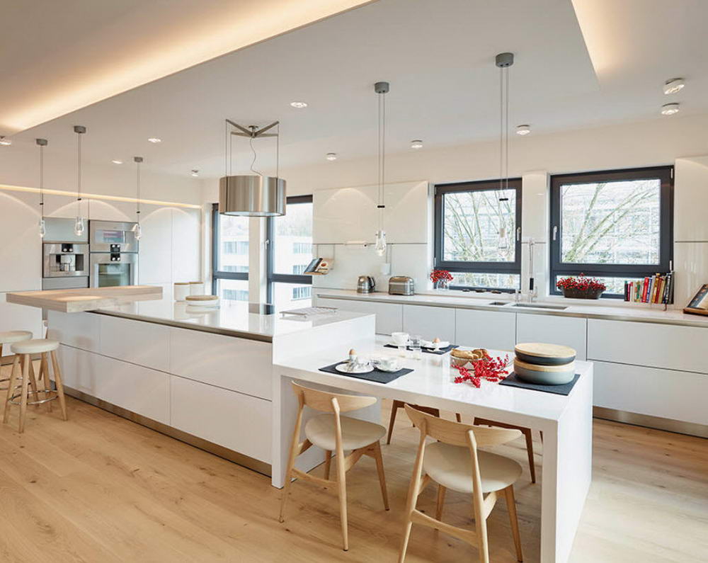 - Планировать схему освещения кухни нужно до ремонта. Лучше всего делать это на этапе, когда уже определено расположение рабочей зоны, обеденного стола и зоны хранения.