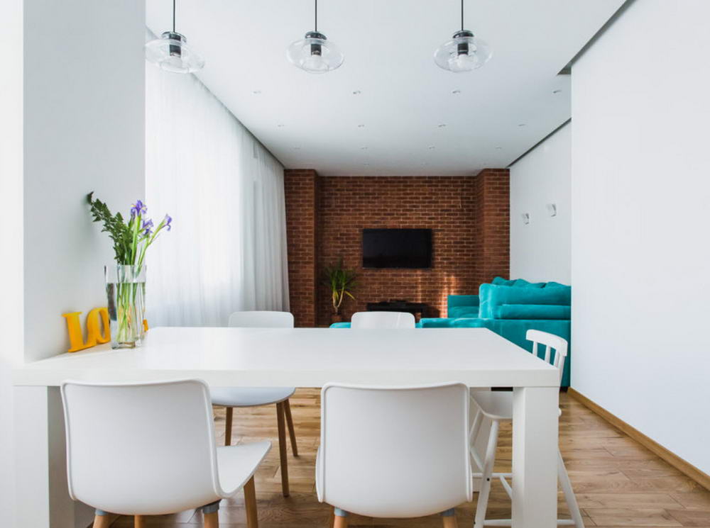 В узком длинном помещении удачнее будут выглядеть не компактный светильник, а более современный его вариант, состоящий из нескольких источников света на одной линии. Он позволит более равномерно осветить комнату вытянутой формы, особенно, если рабочая и столовая зона разнесены по разным ее краям