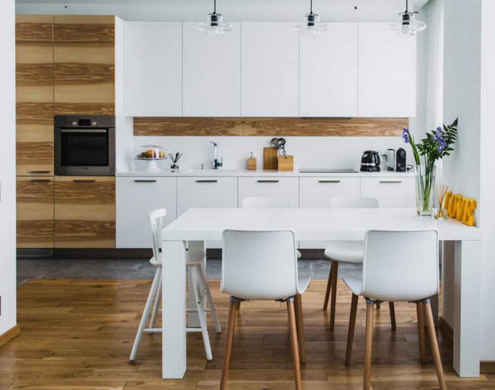 В стиле минимализм используются простые, лаконичные светильники. Над обеденным столом устанавливают строгую люстру с ярким светом, а в качестве дополнительного освещения используют споты. Светодиодная подсветка столешницы также будет уместна;