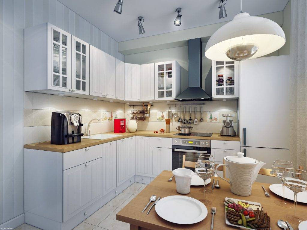 - Максимально увеличит все размеры кухни сочетание светлых поверхностей и достаточное количество источников освещения, включая люстру.