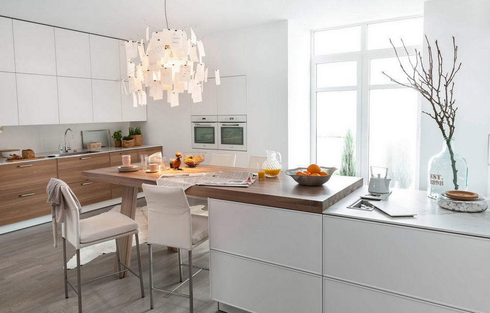 В более просторном помещении люстру лучше расположить над обеденным столом, не ниже, чем на высоте 1,2–1,4 м от него, чтобы у сидящих за ним людей не возникало дискомфорта. Для рабочих поверхностей в этом случае понадобится дополнительное локальное освещение
