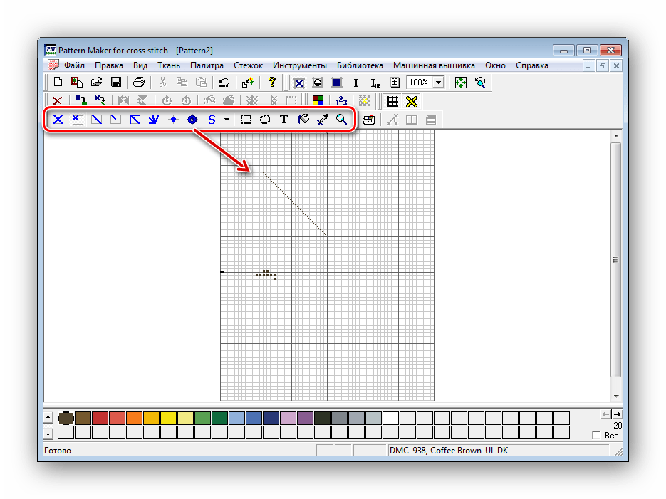 Дополнительные действия осуществляются в редакторе. Здесь пользователь может вносить изменения в готовую схему с помощью нескольких инструментов. Присутствуют разные виды узлов, стежков и даже бисер. Изменяются их параметры в специально отведенных окнах, где находится небольшое количество различных опций. Pattern Maker на данный момент не поддерживает разработчиками, что заметно по довольно устаревшей версии программы.
