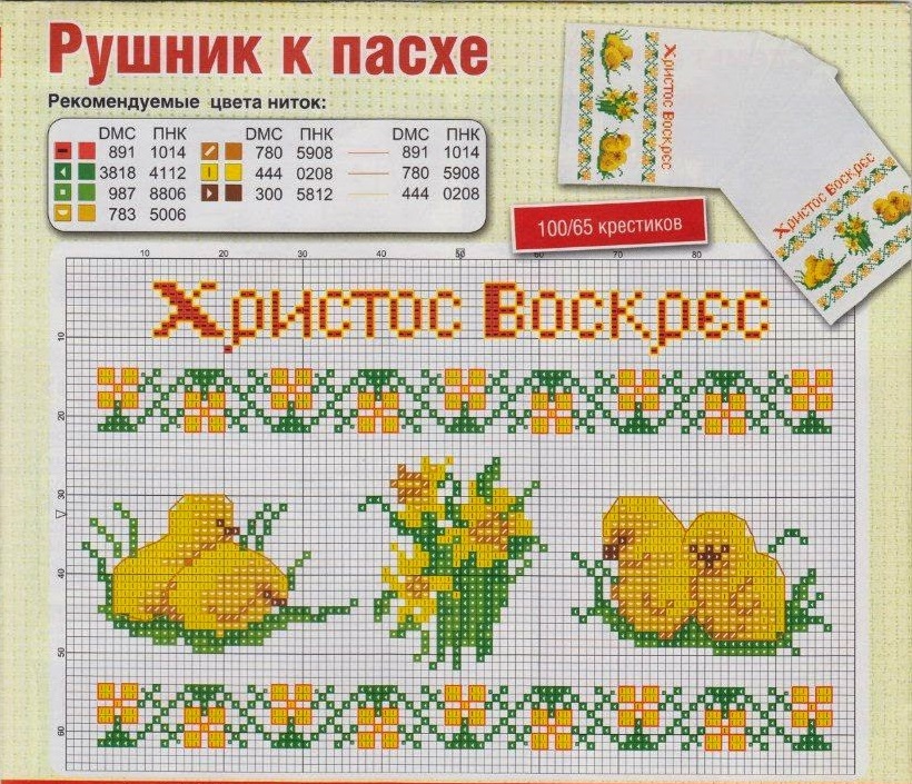 Готовый рушник с пасхальной вышивкой крестом, схема которого предложена ниже, нужно прополоскать в прохладной воде с добавлением уксуса. Пропорция раствора — 1 ст. л. на 1 л. воды. Это поможет сохранить яркость цветов и предотвратит линьку изделия.