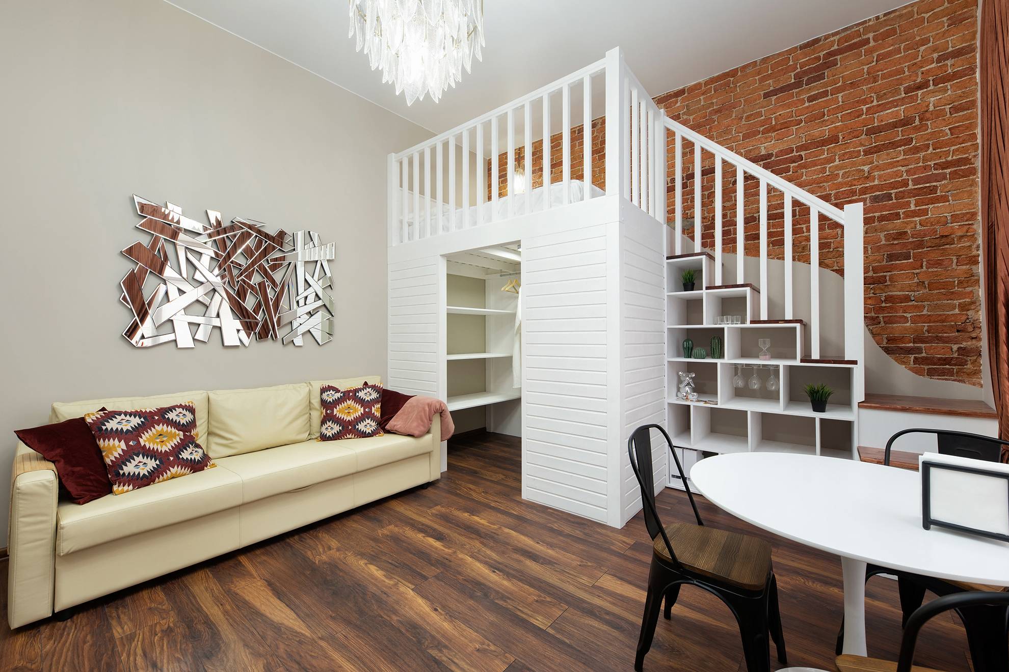 Чтобы не рисковать здоровьем, оборудуя верхний ярус, важно правильно выбрать лестницу. Маленькие пространства, конечно, потребуют компактного решения (которое, впрочем, вряд ли станет самым безопасным)