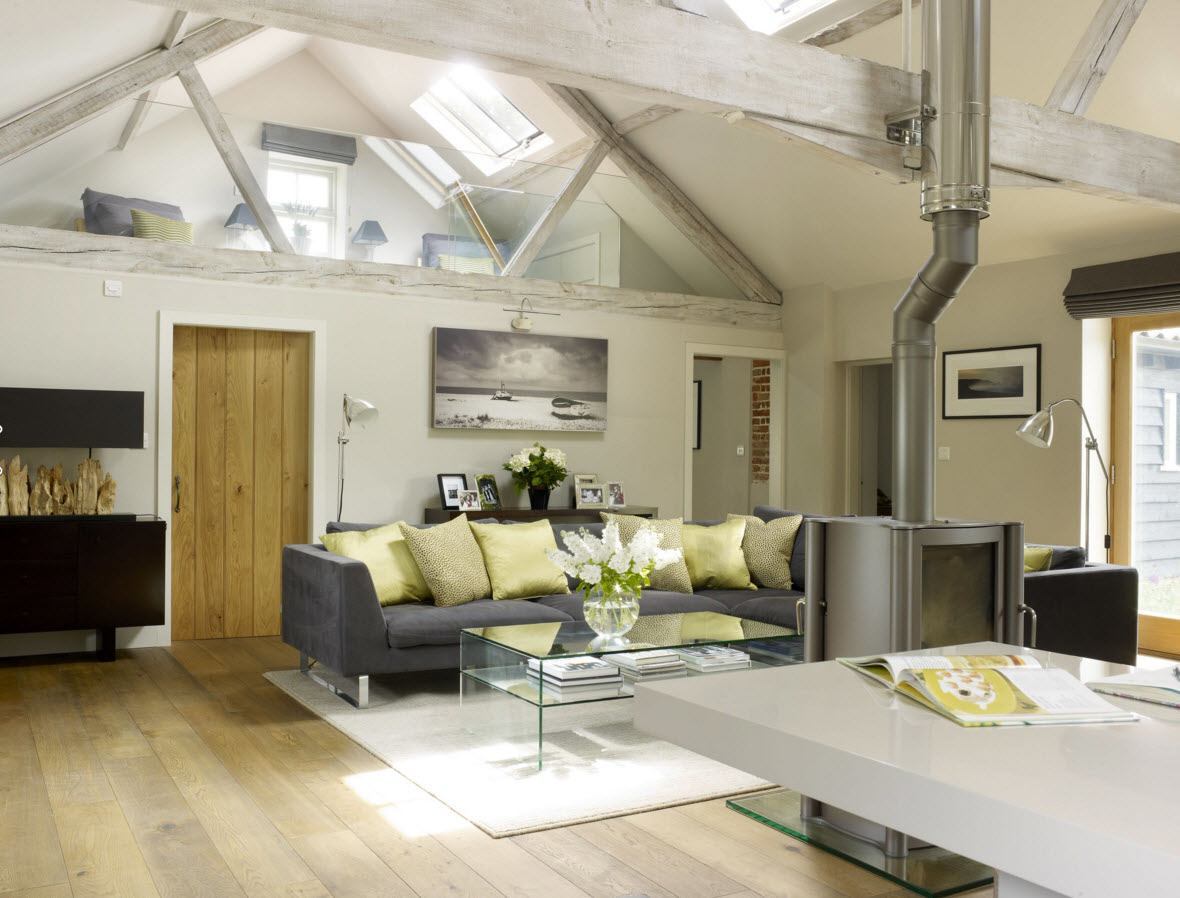Интересно смотрятся балки — деревянные или гипсокартонная имитация. Для балок выбирают следующие схемы расположения: