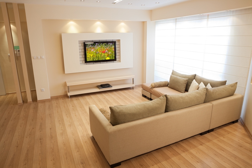 Стена с телевизором не должна носить броских или кричащих тонов. Лучше выбирать белую, кремовую, бежевую, пастельные краски. Если позволяют габариты помещения, стена оформляется в черном цвете.