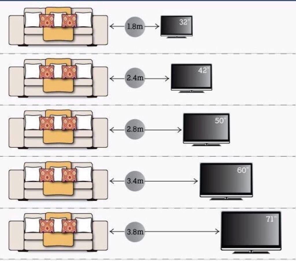 Правильное размещение включает в себя не только высоту от пола, но также и удаленность от сидячих мест, которыми пользуются люди во время просмотра телевизора или работы в интернете (на Смарт ТВ).