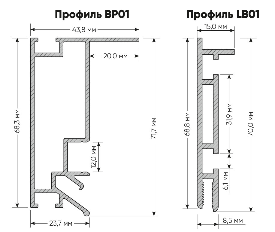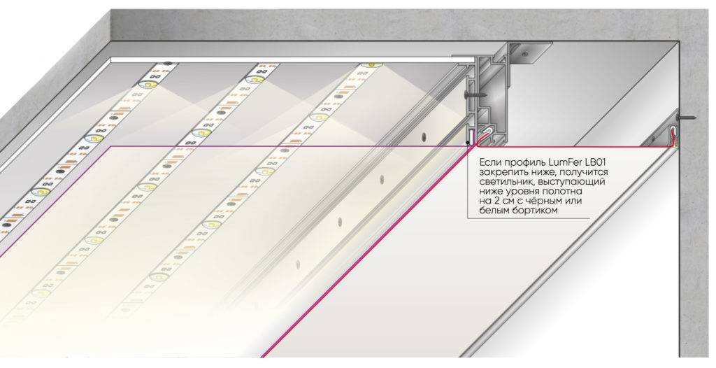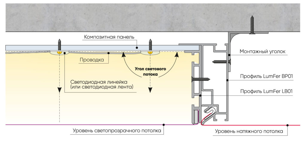 Лампа монтируется из двух профилей – Lumfer BP01 и Lb 01 исполненных в белом и черном цвете. Верхняя часть конструкции закрывается композитной панелью, к которой крепится светотехника. Светопрозрачное полотно закрепляется по периметру силиконовой лентой.
