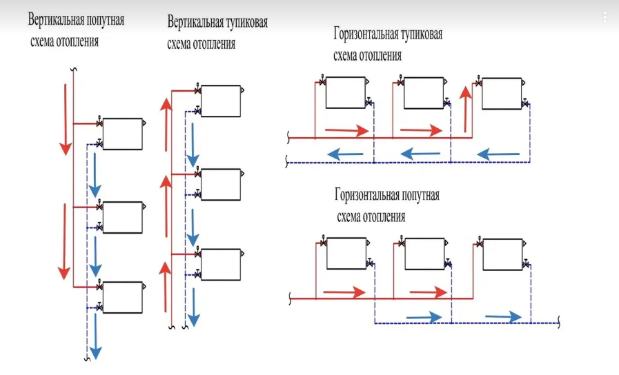 Тупиковая и попутная система могут быть горизонтальными и вертикальными. Их можно проложить по длине в здания или по его высоте.
