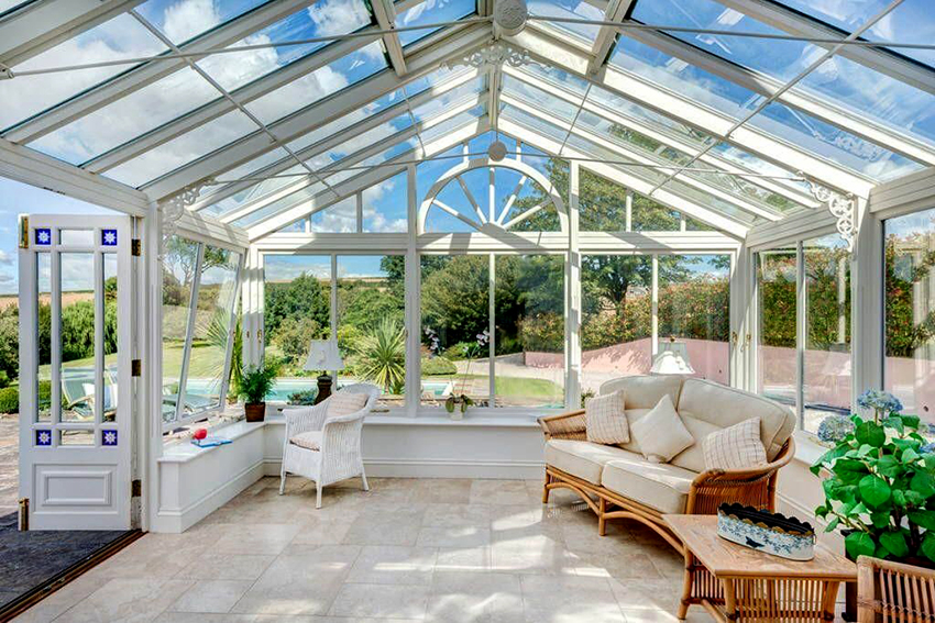 Остекленные крыша и стены закрытой веранды – замечательный вариант дизайна. Границы помещения такой приём визуально расширит. Эту самую светлую комнату можно будет превратить в помещение определённых увлечений, встреч.