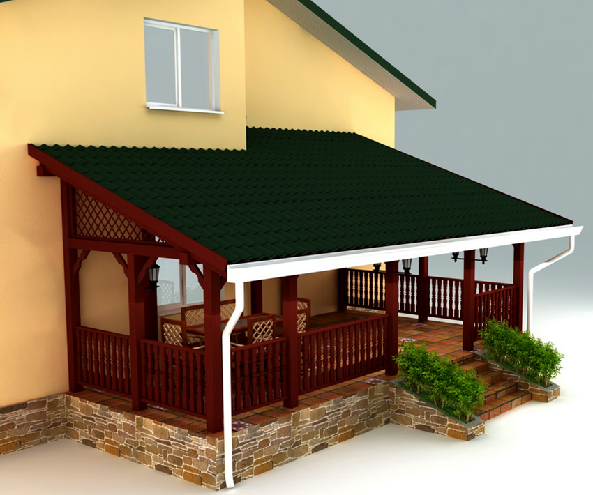 Чтобы построить террасу к дому и придать строению привлекательный внешний вид, нужно грамотно организовать крышу или выполнить навес. Если пристройка примыкает вплотную к дому, то на крыше укладывается такой же материал, как и на основном здании. В случае если терраса вынесена отдельно от здания или отличается внушительными размерами, лучше выполнить двухскатную крышу.