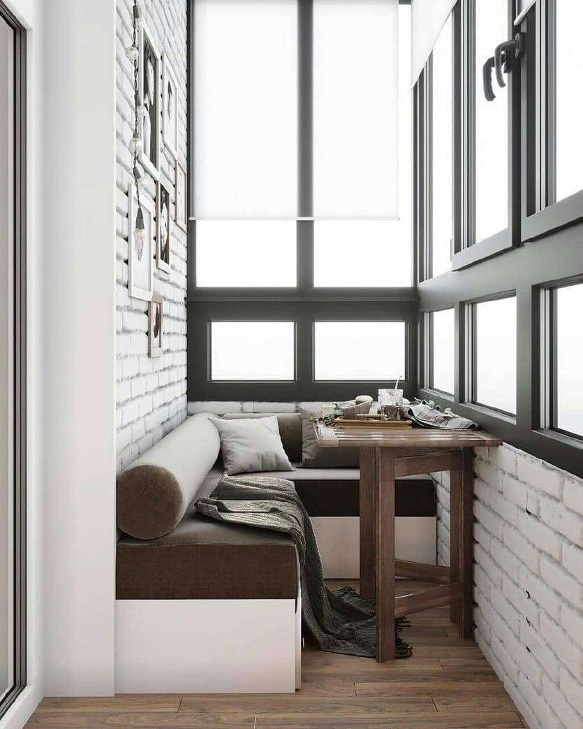 На фото стены в дизайне балкона, выложенные кирпичом серого цвета.