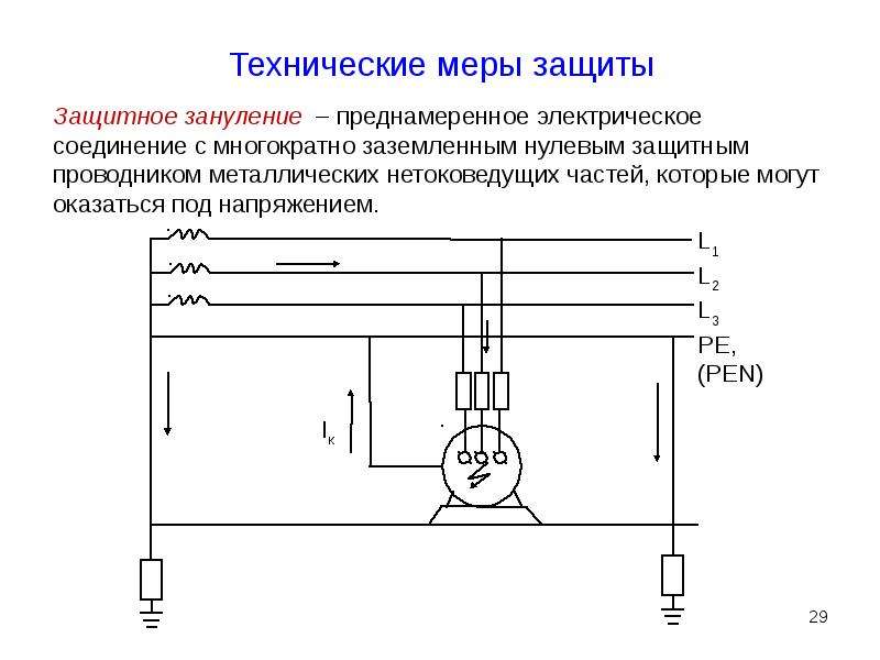 - ПУЭ 7. Пункт 1.7.31 – защитное зануление в электроустановках напряжением до 1 кВ преднамеренное соединение открытых проводящих частей с глухозаземленнойнейтралью генератора или трансформатора в сетях трехфазного тока, с глухозаземленным выводом источника однофазного тока, с заземленной точкой источника в сетях постоянного тока, выполняемое в целях электробезопасности,