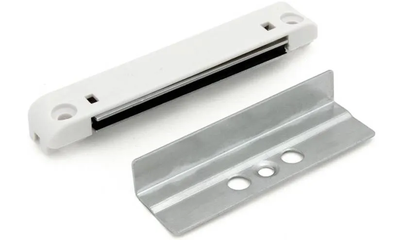 В продаже сегодня можно увидеть различные варианты магнитной защелки, но самой популярной остается модель Г-образной формы. Она оснащена отверстиями, причем они расположены в том месте, где сосредоточена стандартная фурнитура. Таким образом, удается закрепить планку без приложения особых усилий. Есть защелки, у которых отсутствуют отверстия. Решить эту проблему очень легко, если просверлить их, используя обычную дрель.