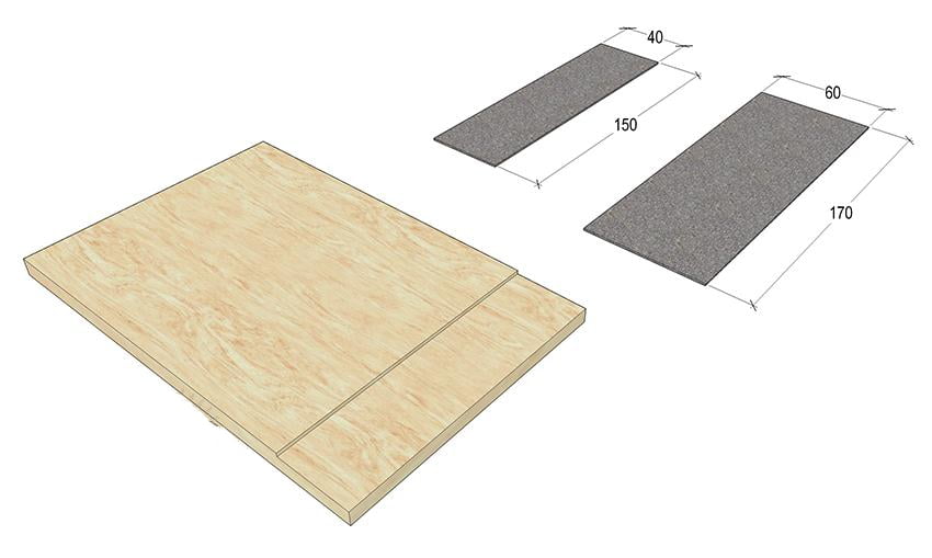 - Рабочий стол. Для нормально функционирующего станка вам понадобиться три поверхности. Одна будет служить рабочим столом для циркулярной пилы, а две других для фуговального станка. Толщина материала для рабочей поверхности должна быть не менее пяти миллиметров. Для этих целей подойдет многослойная фанера или металлические листы. При этом желательно сделать небольшую разницу по высоте для поверхностей, предназначенных для фугования. Та сторона, по которой будет подаваться заготовка должна быть на пару миллиметров ниже то, на которую перейдет уже обработанная сторона. Такой перепад облегчить работу и существенно снизит вибрацию.