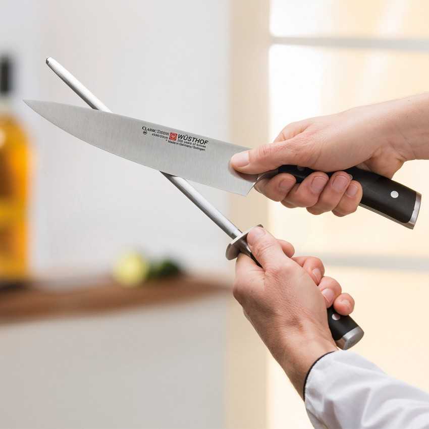 Мусат используется для корректировки лезвий – заточке перед использованием. При помощи стальки у вас не получиться полностью заточить тупой нож, но сделать притупленный нож острее – без проблем.