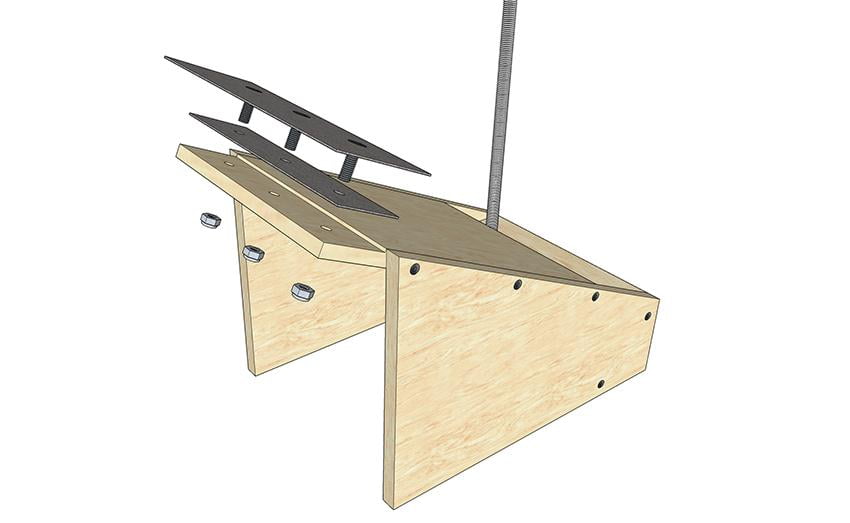 Из фанеры собираем станину, опирающуюся на ножки под углом 15°-20°. В ту часть, которая ниже, закручиваем шпильку длиной 30-40 см. Для прочности можно резьбу закрепить клеем или герметиком.