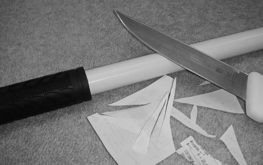 - второй нож – два прибора нужно взять в обе руки и проводить одним краем по-другому, спустя 5 – 10 минут работы кромка станет значительно острее.
