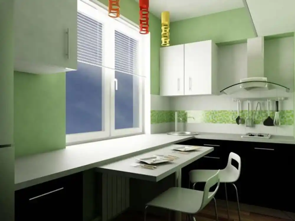 - потолок, пол, столешница должны быть выполнены в нейтральных цветах, например, белом, сером или бежевом. Яркость допустима лишь в немногочисленных аксессуарах. Стоит следить и за сочетаемостью цветов. С зеленым отлично смотрятся желтый, красный, оранжевый, синий, коричневый и иногда черный. Но последними двумя не стоит злоупотреблять.