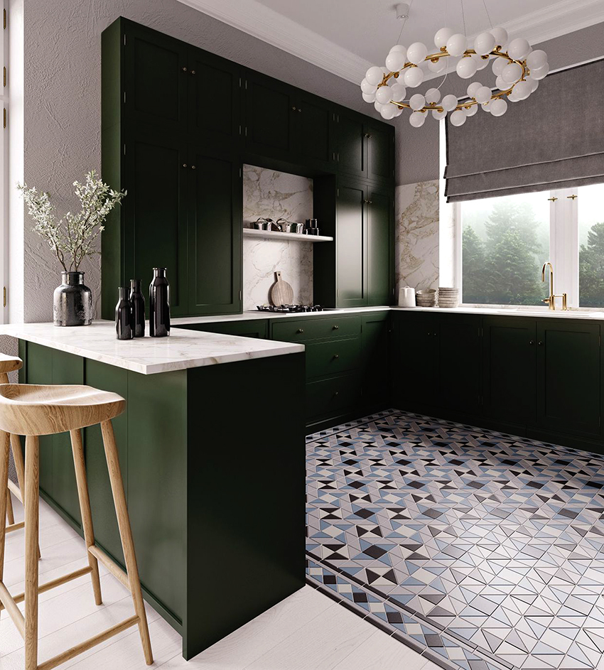 Когда вы выбираете более темный оттенок, вы действительно можете весело провести время, играя с контрастами, и вы можете представить это с помощью драматических идей кухонной столешницы. Чем более глубокий зеленый цвет вы выберете, тем драматичнее будет выглядеть мрамор, а если он имеет высокий уровень прожилок, то тем лучше, так как он добавит в пространство сказочный декоративный элемент.
