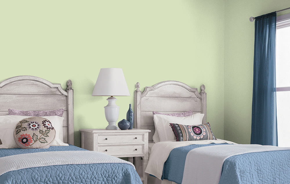 Фисташковый оттенок способен сгладить эмоциональные перегрузки. Интерьер спальни или гостиной в таком цвете будет выглядеть нежным и гармоничным.