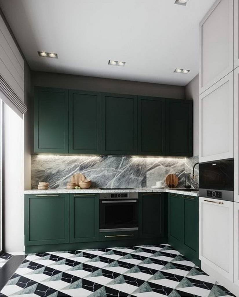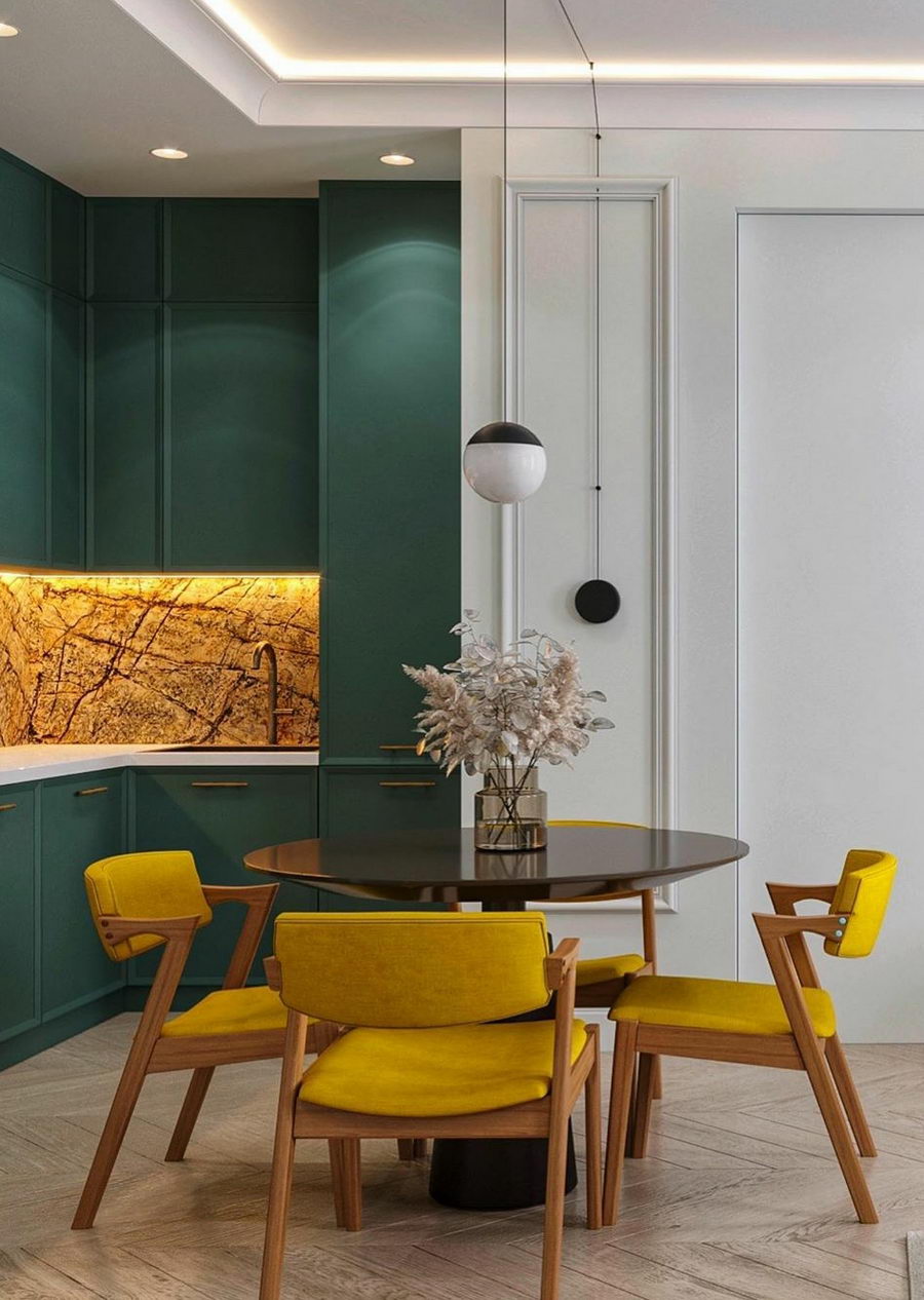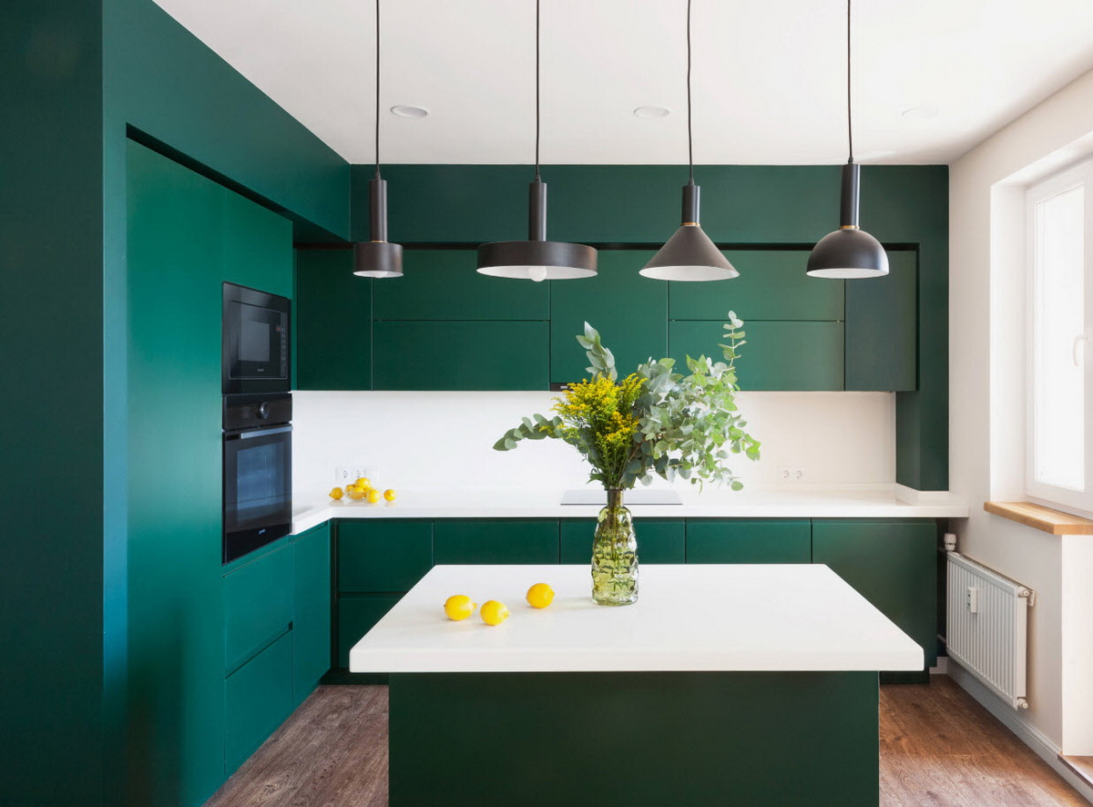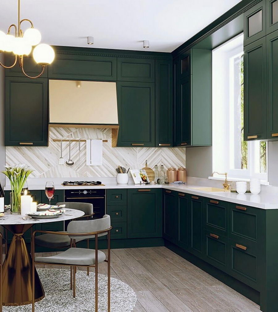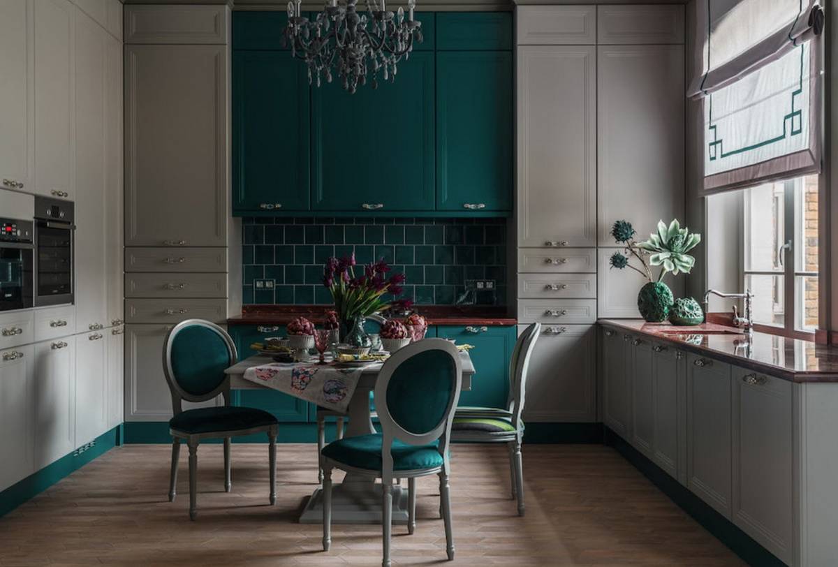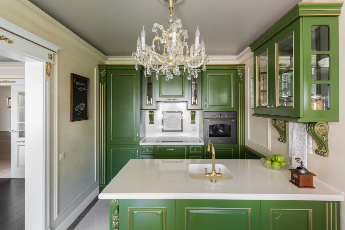 Этот тон хорошо сочетается с золотом, что можно выгодно обыграть с помощью техники, элементов декора и отделки. Единственный нюанс – обилие изумрудного не подойдет для очень маленькой кухни. Этому цвету нужен простор, чтобы не выглядеть «тяжелым» и мрачным.