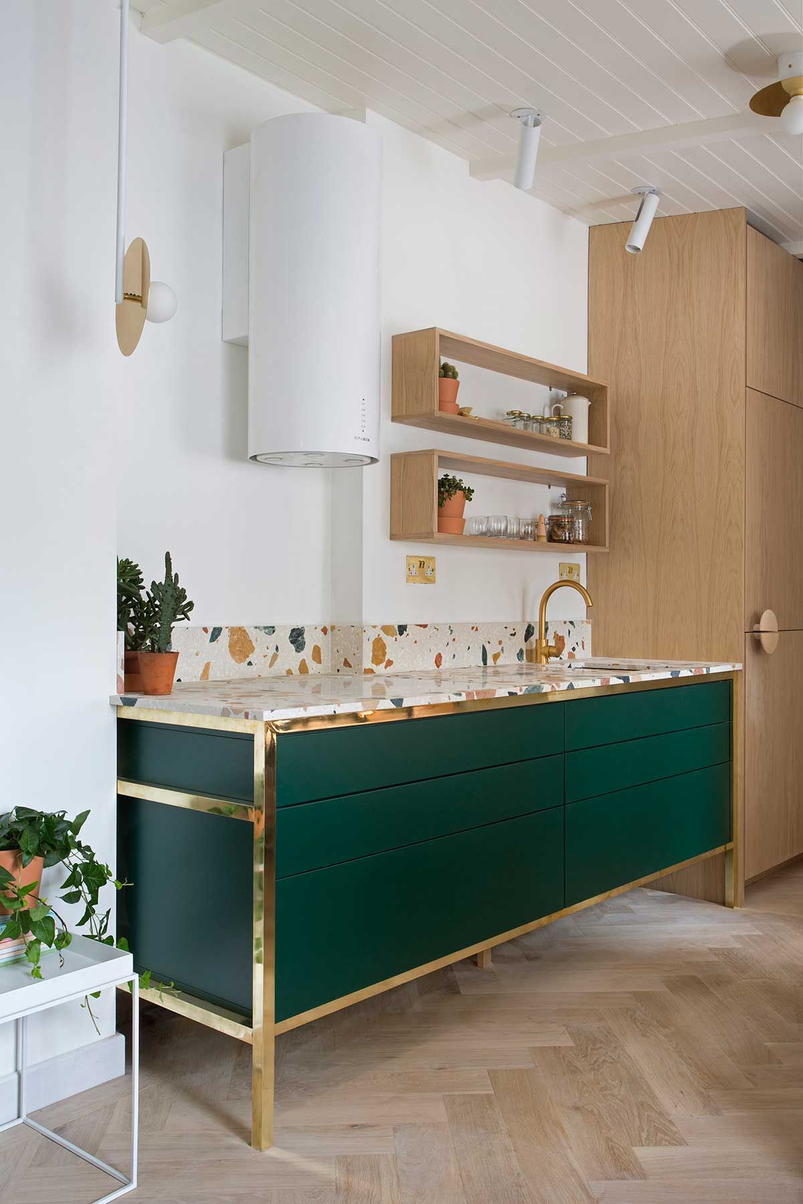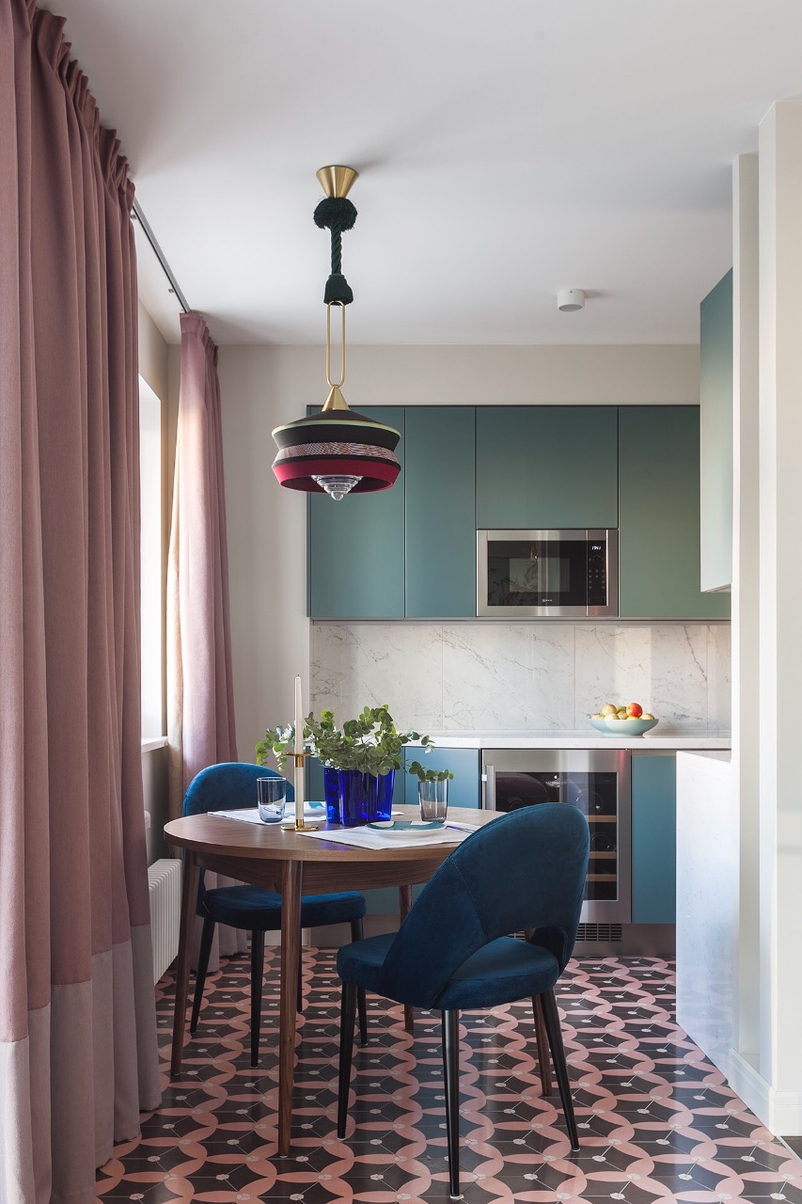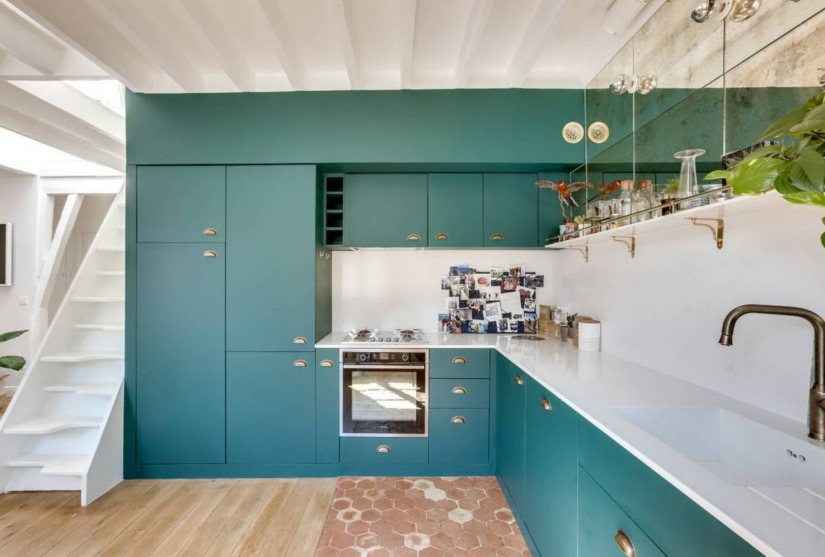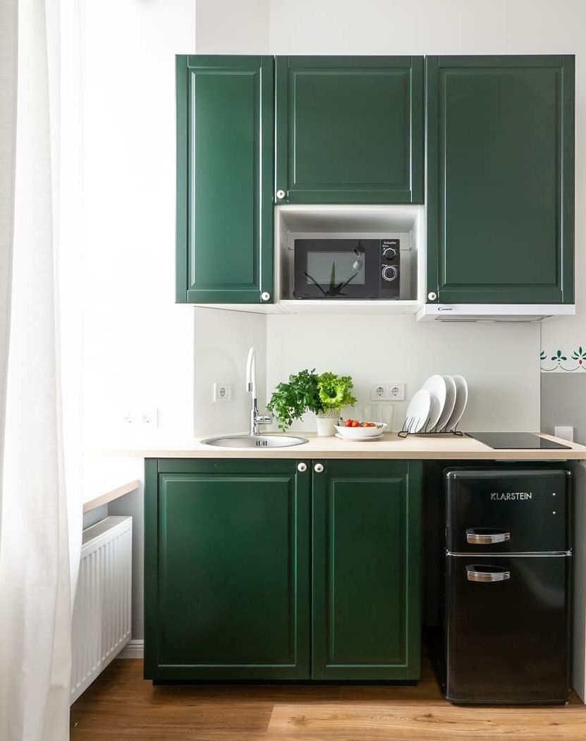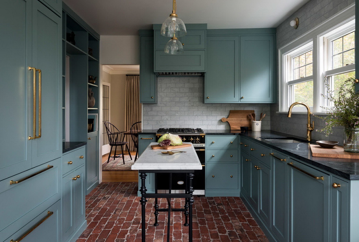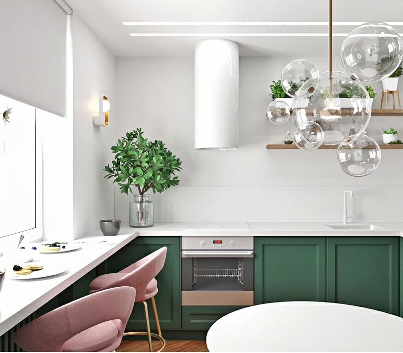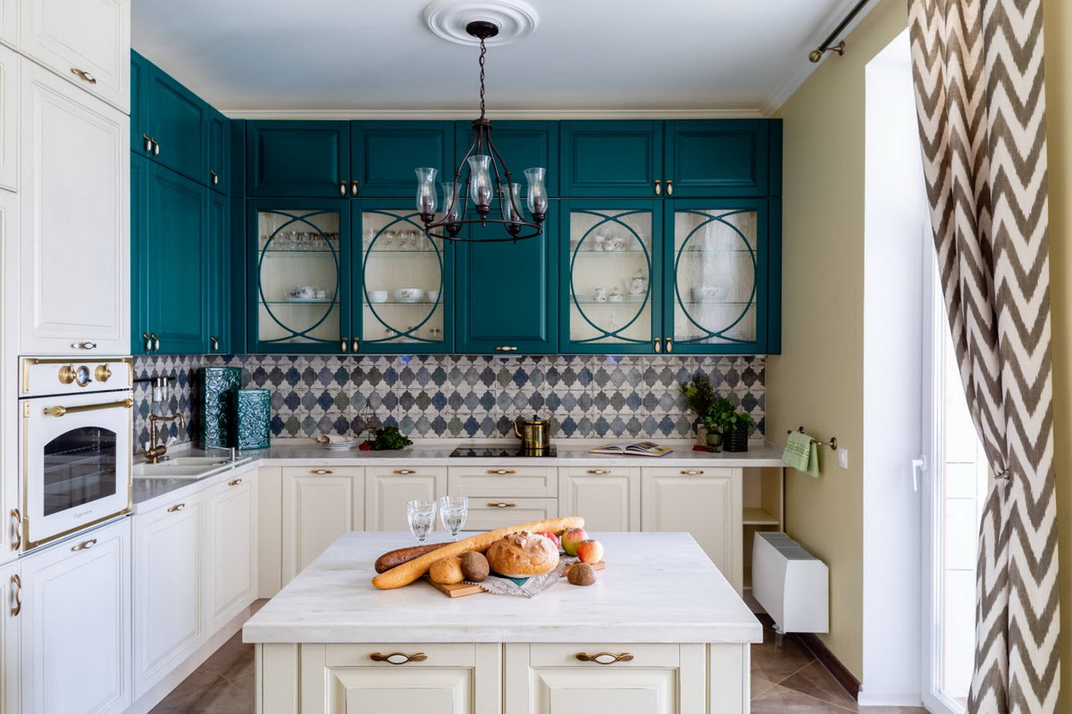 Этот тон хорошо сочетается с золотом, что можно выгодно обыграть с помощью техники, элементов декора и отделки. Единственный нюанс – обилие изумрудного не подойдет для очень маленькой кухни. Этому цвету нужен простор, чтобы не выглядеть «тяжелым» и мрачным.