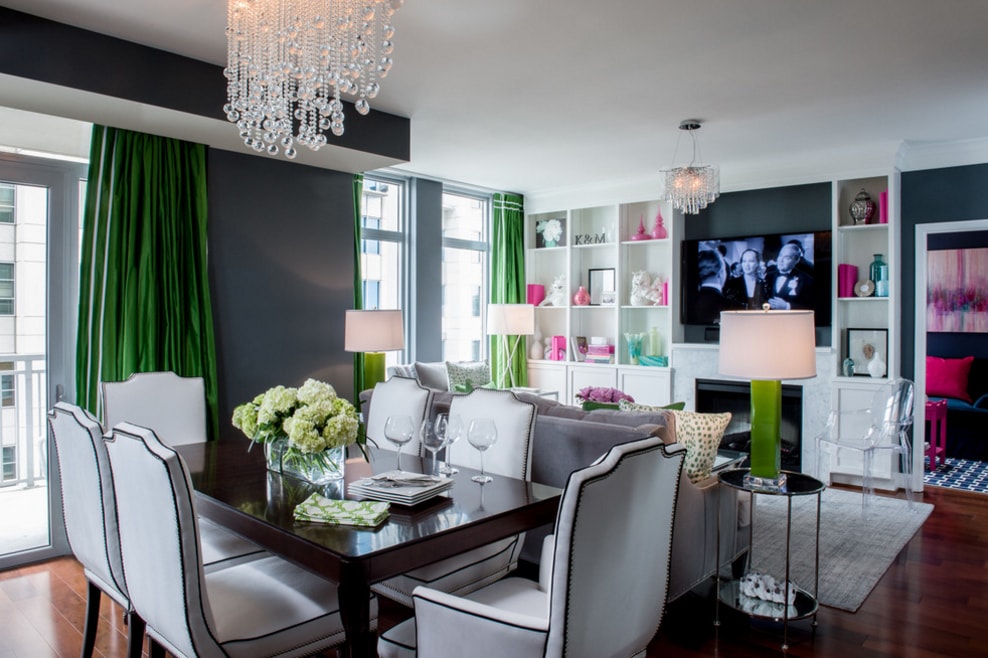 Практически все оттенки зеленого хорошо сочетаются с белым, желтым и оттенками коричневого. Оригинальным решением может стать сочетание зеленого с черным. А дополнительной яркости добавят красные акценты в интерьере.