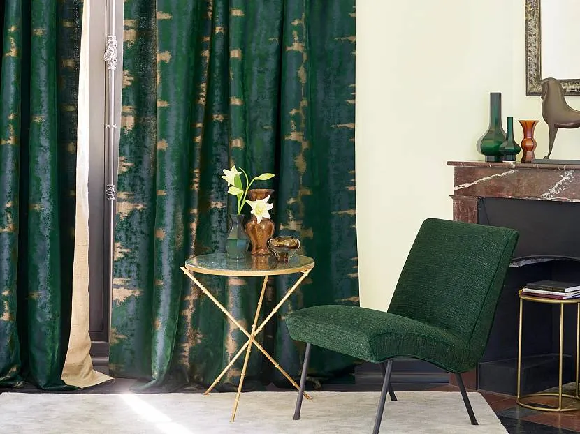 Необходимо дополнить шторы зелёного цвета связующими элементами в интерьере. Взаимосвязь деталей позволит создать лаконичное оформление.