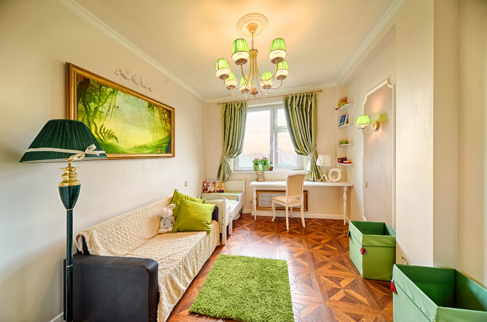 Психологи советуют использовать зеленый цвет в интерьере деткой, так как он хорошо сказывается на самочувствии ребенка
