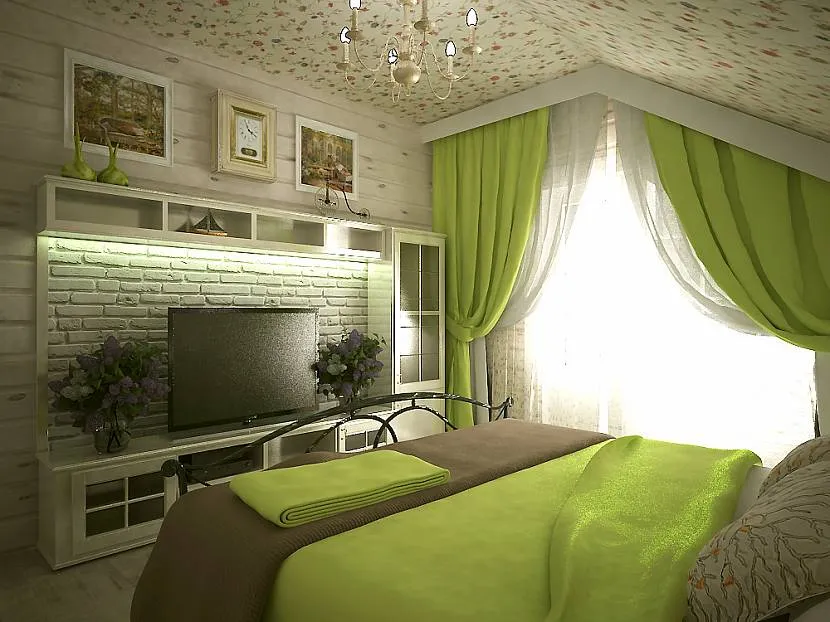 Спальня со шторами зеленого цвета