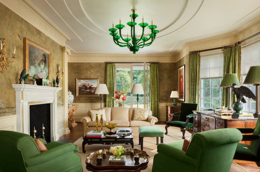 - Приглушенным зеленым фоном (если портьеры яркие, то приглушенными могут быть гардины);