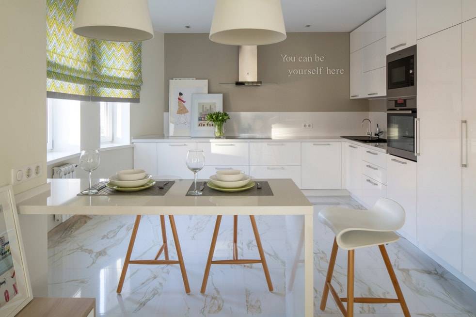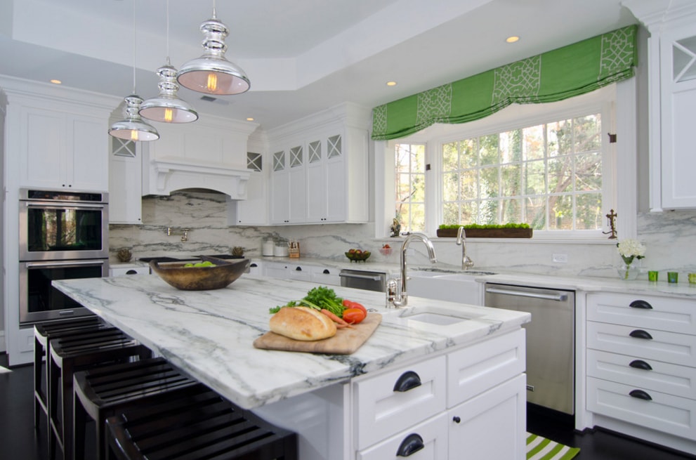 Функциональность кухни не знает границ: изо дня в день здесь готовится пища, выбрасывается мусор и порой даже стирается одежда. Еще внутри кухни приходится принимать пищу. Поэтому шторы универсальной комнаты должны выделяться: