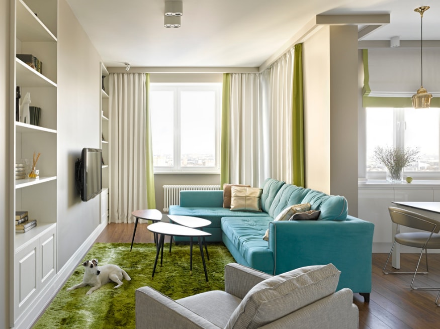Цвет морской волны относится к сине-зеленой гамме и его действие похоже на впечатление от морской глади. Спокойствие, уют и ровное настроение обеспечены гостиной;