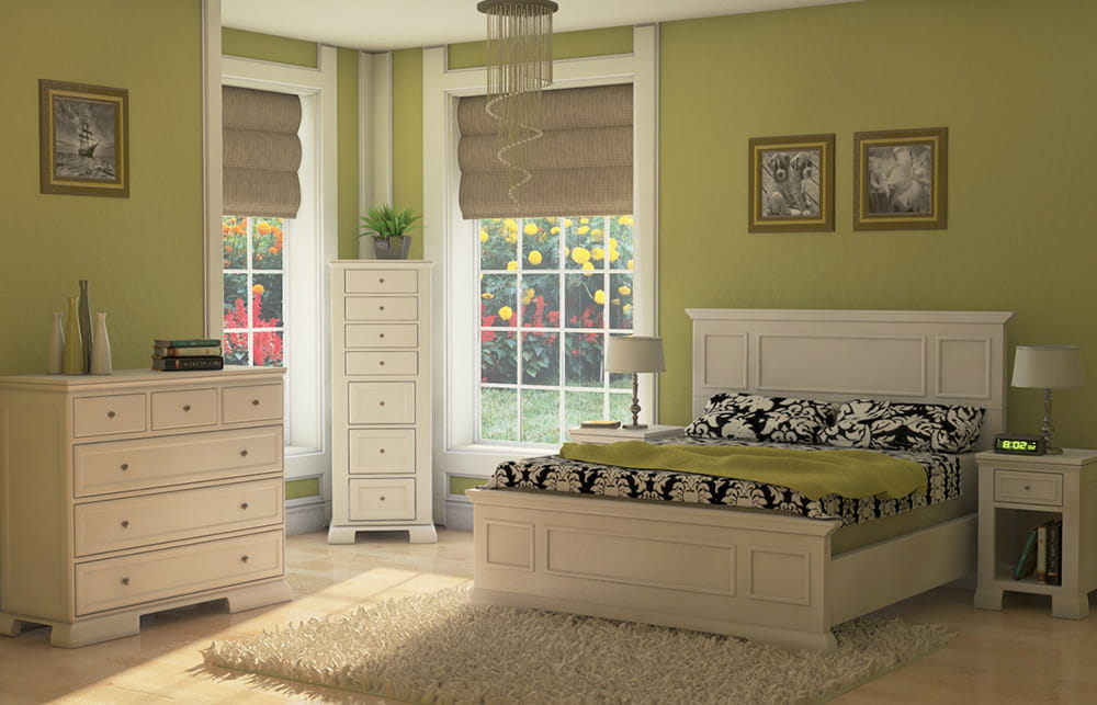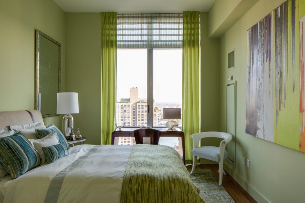 Очень часто спальню полностью оформляют в разных оттенках зеленого. Смотрится это довольно интересно. Но подойдет такое решение только тем, кто очень любит этот цвет, так как через время он может начать утомлять. В качестве альтернативного варианта предлагаем использовать два комплекта штор: белые и зеленые. Периодически меняйте их, чтобы не привыкать к одной и той же палитре.