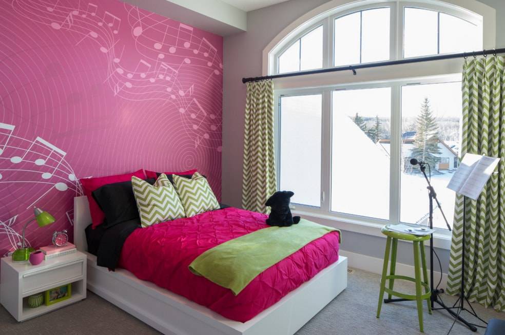 С фуксией. Очень стильное сочетание. Фисташио цвет неконфликтный, поэтому отлично подчеркивает яркость фуксии. Можно дополнить розоватым или бежевым оттенком. Хотя бы одна стена должна быть однотонной фисташковой, иначе цвет потеряется в обилии красок.