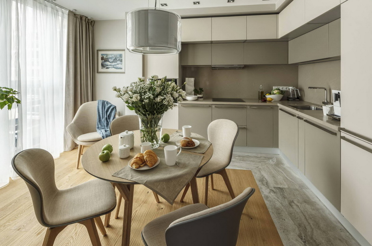 Элегантный и успокаивающий – именно такие ассоциации вызывает этот тон. Он отлично смотрится на глянцевых фасадах кухонного гарнитура. Этот оттенок является теплым и наполняет теплом и уютом кухню.
